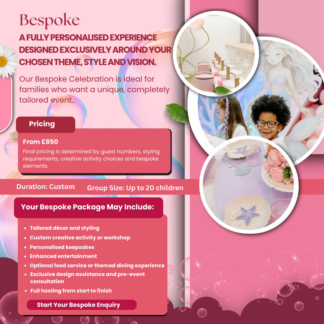 At Frills & Fun, every event is thoughtfully curated to honour confidence, self-love, creativity and joy. Our setting offers a serene, beautifully styled environment where children feel truly celebrated, and parents can enjoy a completely hands-off experience from beginning to end. With our warm hosting, elegant touches and dedication to creating meaningful moments, every party is delivered with the effortless luxury and passion that defines Frills & Fun.